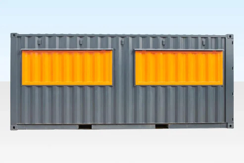 Le conteneur est livré avec une peinture extérieure gris RAL7016 et des fenêtres de service orange RAL2004, mais peut être personnalisé dans n’importe quelle couleur RAL selon les besoins du client. Des équipements de cuisine sur mesure sont également disponibles, incluant éviers, plaques de cuisson, machines à café et fours.