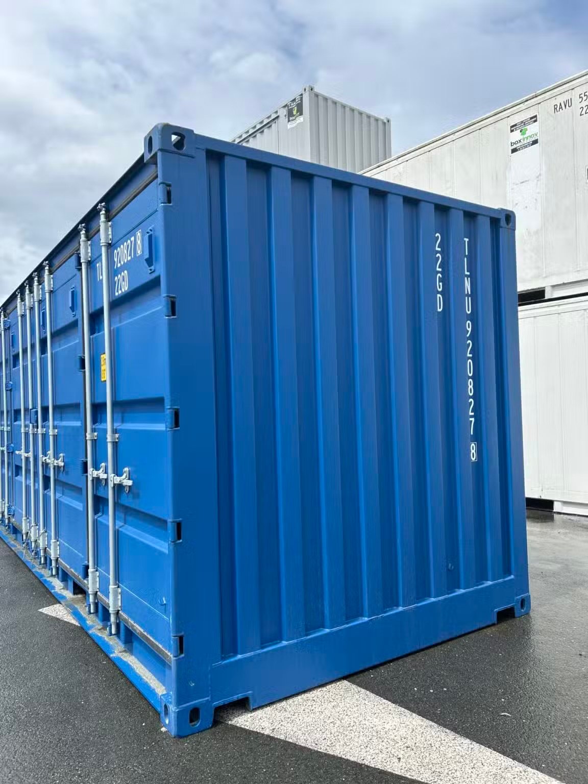 Ce conteneur de stockage ouvert de 6 mètres de long possède quatre portes s'ouvrant sur toute sa longueur, offrant un accès latéral complet.